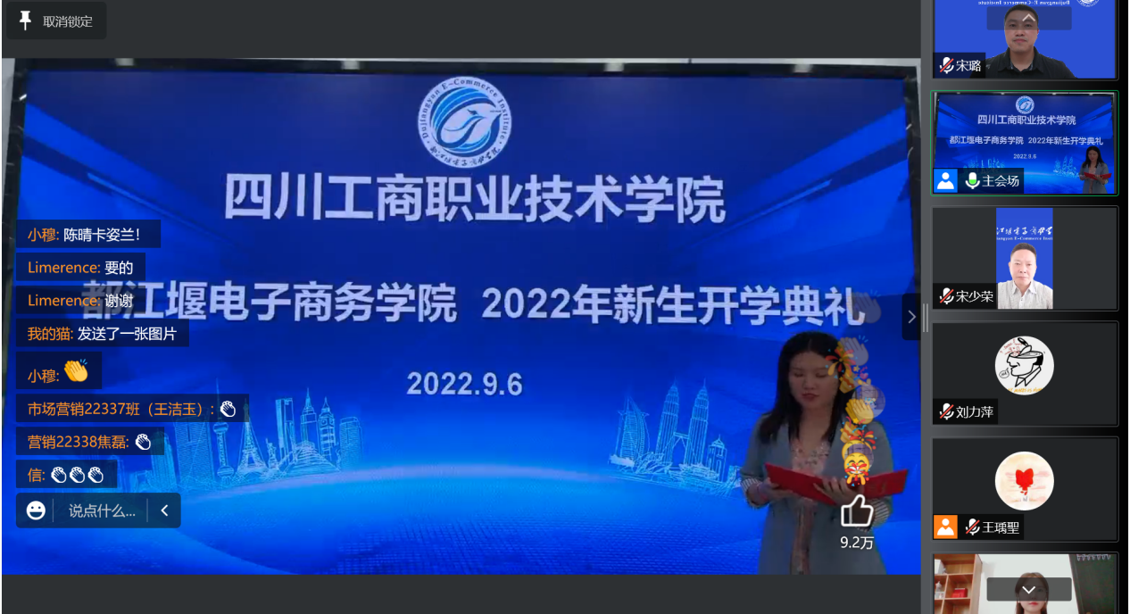 9月6日,2022级新生开学典礼在网络云端隆重举行。都江堰电子商务公司党总支书记向琼英,党总支副书记、经理宋少荣,党总支副书记、副经理宋璐,党总支书记助理王瑀聖,经理助理刘力萍,各教研室老师、辅导员以及已经报到的514名2022级新生参加大会。大会由党总支书记助理王瑀聖主持。典礼在庄严的国歌声中拉开帷幕。