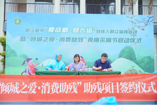 为解决残疾人产品供、销、购中的销售问题成都市残疾人联合会与公司签署自媒体助残合作协议,通过产学研相结合的“授渔计划”、“金融助残e推客”以及“倾城之爱·消费助残”等举措,努力帮助残疾人群体解决资金、技术、销售渠道等方面的困难,助力他们就业创业,积极为他们提供多元共享、人人可及、尽展其才、梦想成真的人生舞台。同时在都江堰“爱成都·迎大运”残疾人群众体育运动暨“倾城之爱·消费助残”青梅采摘节启动仪式当天有三名志愿者负责对远远乡青梅基地进行直播讲解宣传,其他五名志愿者在残疾人群众体育运动中配合其他工作人员进行活动计分。在活动结束后八名志愿者进行会场清理、设施归位工作。