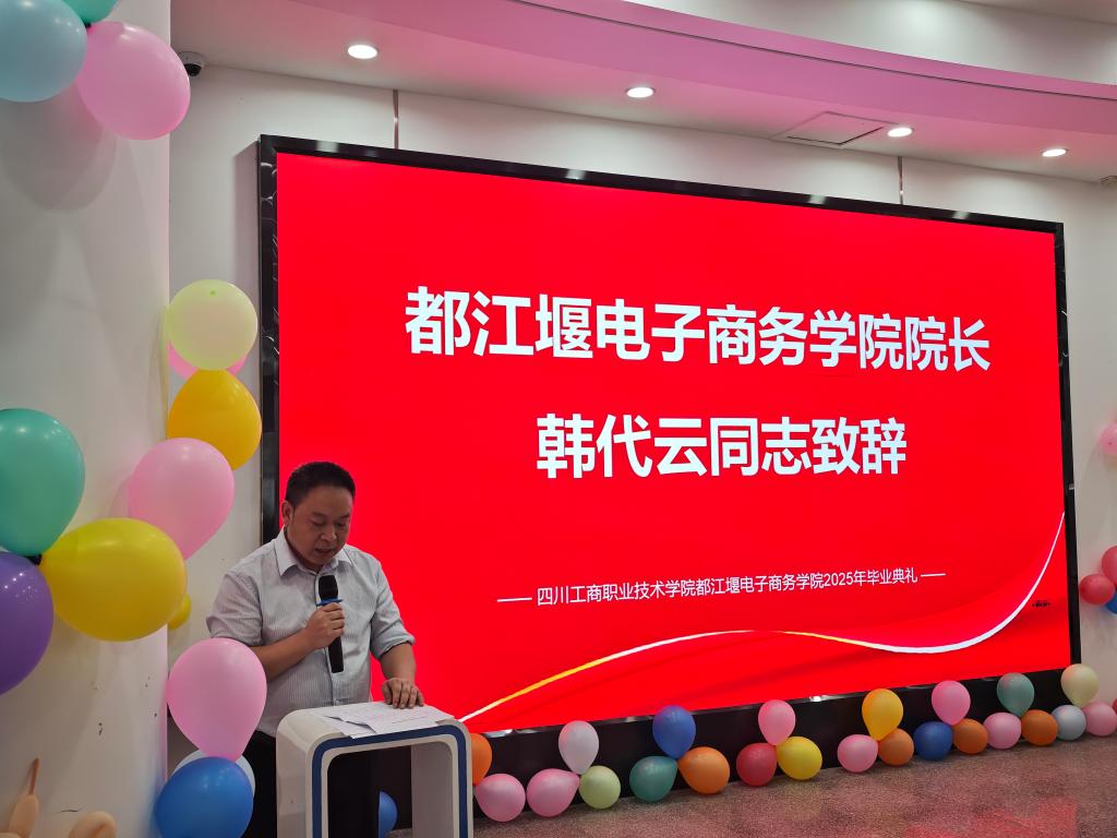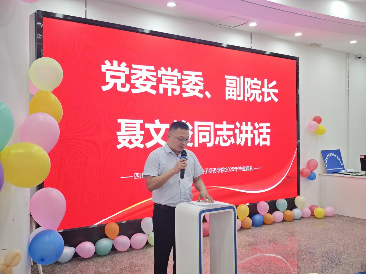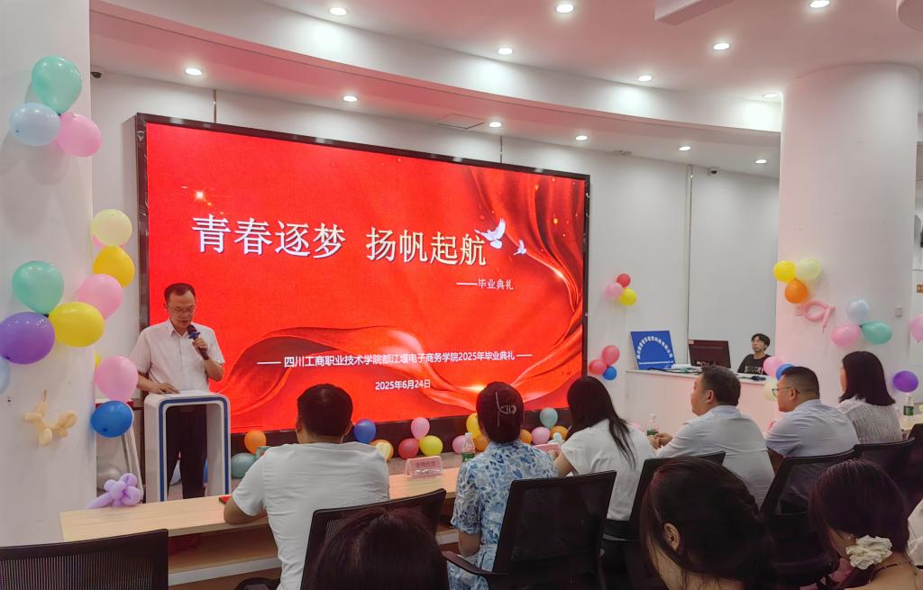 2025年6月24日上午10点30分,2025届毕业生毕业典礼在电商校区一楼展厅隆重举行。四川工商职业技术公司党委常委、副经理聂文俊出席毕业典礼。参加毕业典礼的还有总支书记魏红军、经理韩代云、党总支副书记王瑀聖,各教研室主任以及全体毕业班辅导员、2025届毕业生。