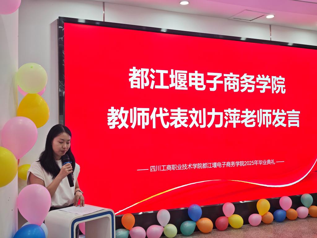 随后,党委常务、副经理聂文俊为2025届四川省优秀大学毕业生颁发荣誉证书。电商22361班谢林沙同学作为优秀员工代表发言,她满怀深情地表达了对母校培育之恩的感激,对师长谆谆教诲的敬意,以及对同窗深厚情谊的珍视。谢林沙同学结合自身的学习实践经历,分享了成长感悟,畅谈了对未来的憧憬与规划,表达了将不负韶华、努力奋斗的决心,并代表全体毕业生向母校和老师们致以最崇高的敬意和最美好的祝愿,她的发言情真意切,引起了在场毕业生的强烈共鸣。“四川省优秀大学毕业生”这份沉甸甸的荣誉是对同学们大学期间德智体美劳全面发展的最高褒奖,也是全院学子的优秀榜样。